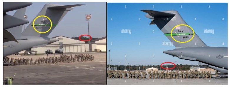 A side-by-side comparison of the image from the video (L) and the Alamy photo (R) shows that the two pictures were taken in the same location and show the same plane.