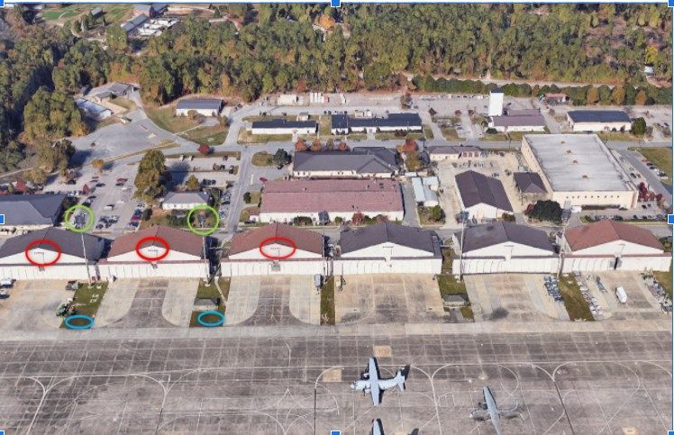A Google keyword search for images of the military airfield at the Fort Bragg Army base found photos of a building and an aircraft similar to the one in the video in the photo archive of stock photography agency Alamy.