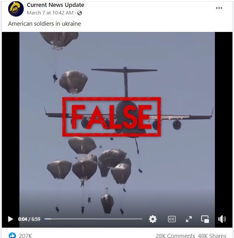 A video of soldiers jumping out of a plane with parachutes has been shared tens of thousands of times on Facebook alongside a claim that it shows US paratroopers joining the war in Ukraine. But this is false: the footage, which has been viewed millions of times, has been online since at least 2016 and features US soldiers performing parachute drills at the Pope Army Airfield in North Carolina.