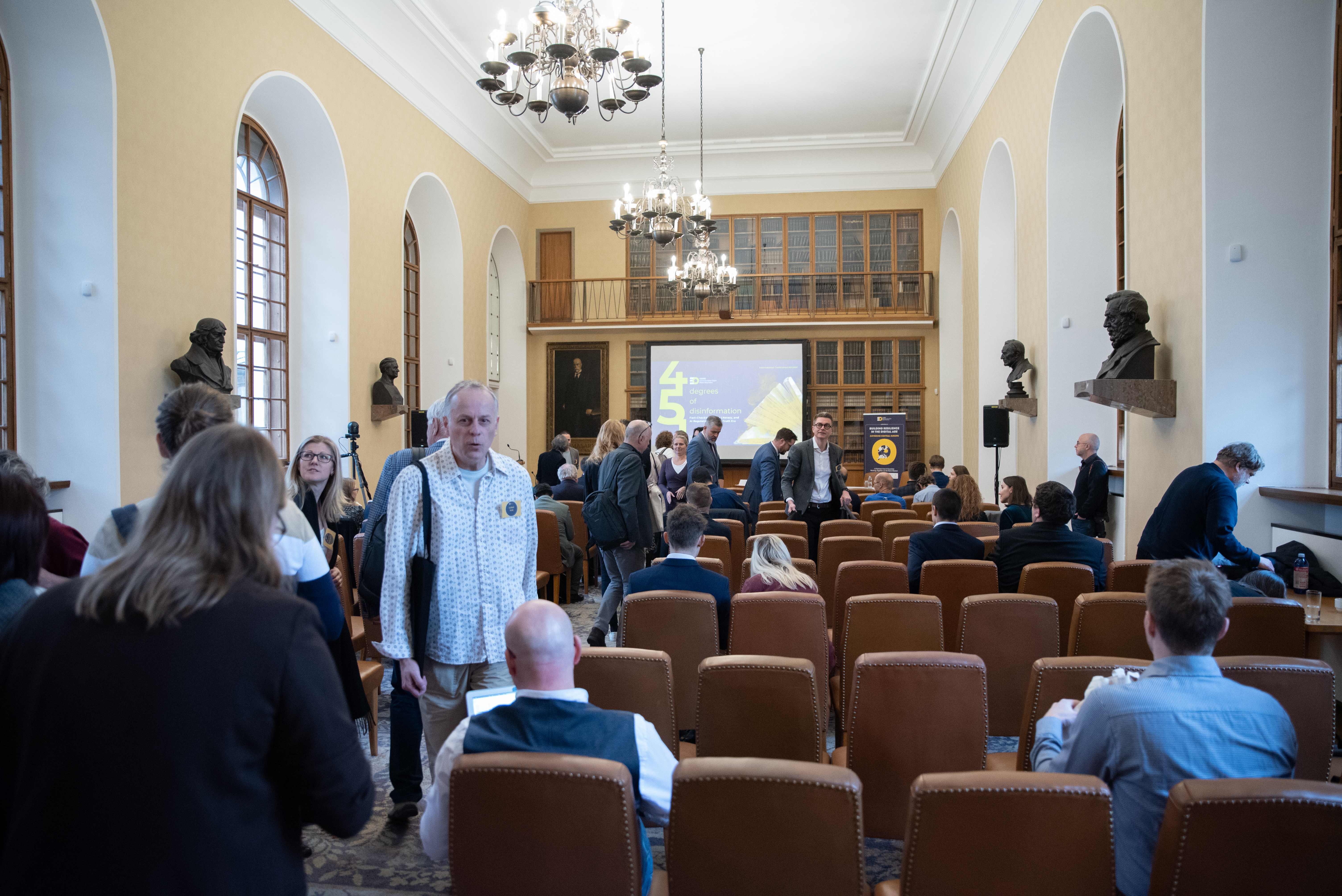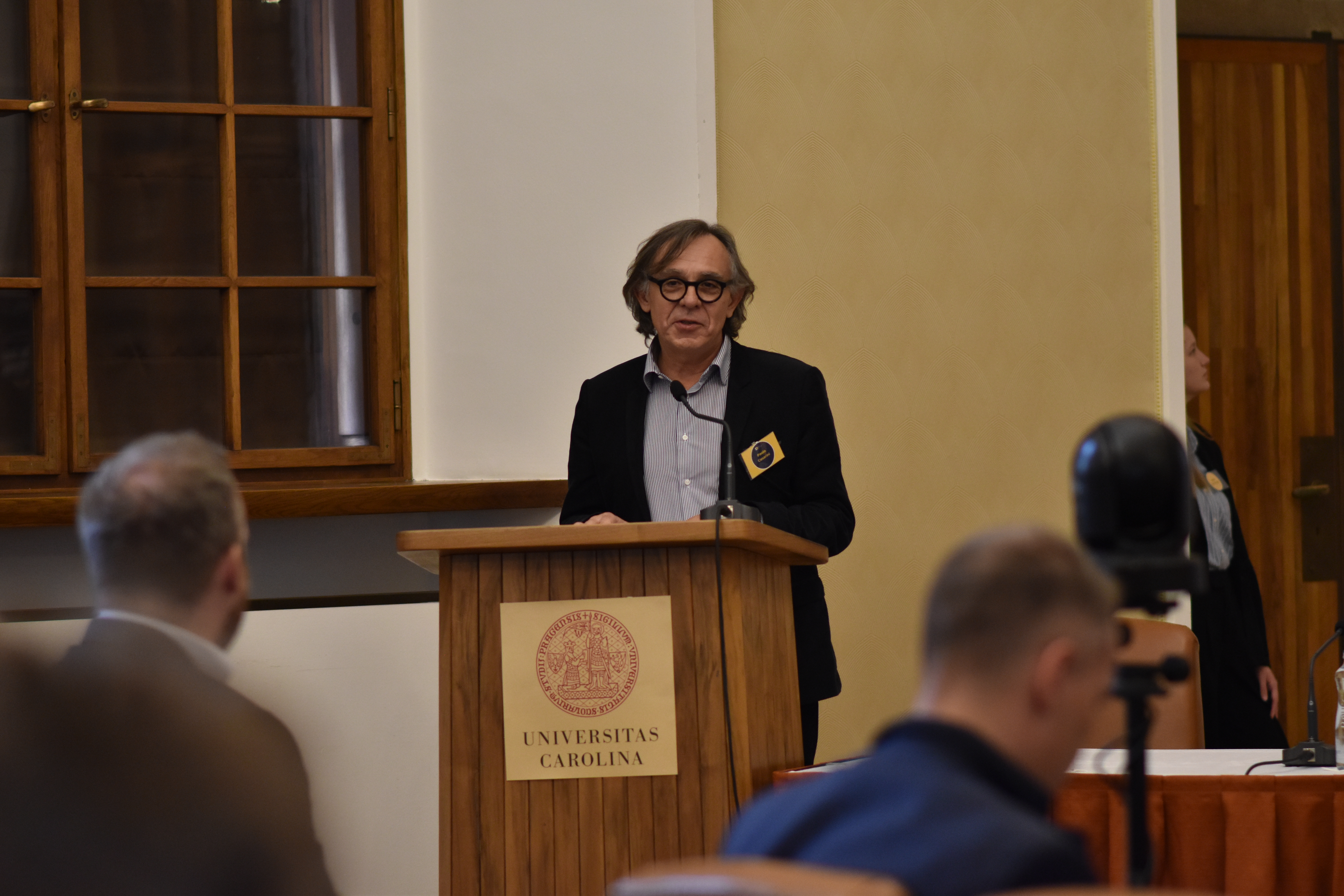 The first keynote speaker, Václav Moravec, the lead coordinator of the Central European Digital Media Observatory, warmly welcomed the attendees. He drew attention to the symbolic significance of the venue, the Patriotic Hall, historically the university library, and its connection to this year’s theme inspired by Ray Bradbury’s book “Fahrenheit 451.”