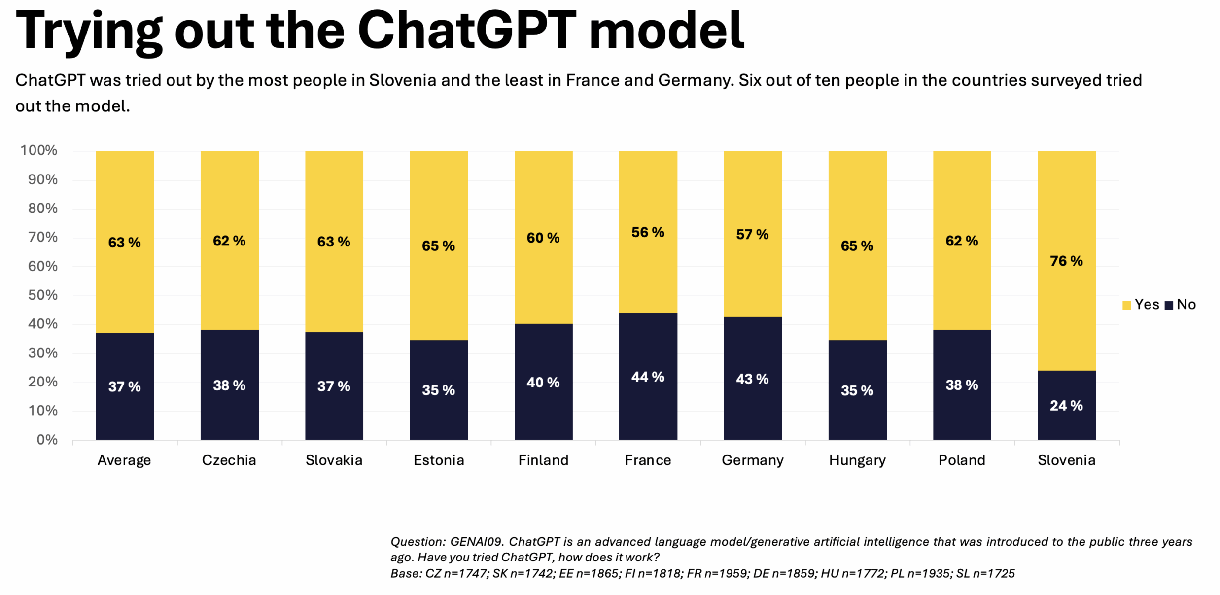 Since its launch, 63% of respondents have tried ChatGPT, with Slovenia leading at 76%. Most users experimented with the tool out of curiosity (77%), while almost three-quarters used it to verify information, especially young people aged 15 to 24. Overall, 83% of users found ChatGPT useful, though skepticism remains strongest in France and Germany.