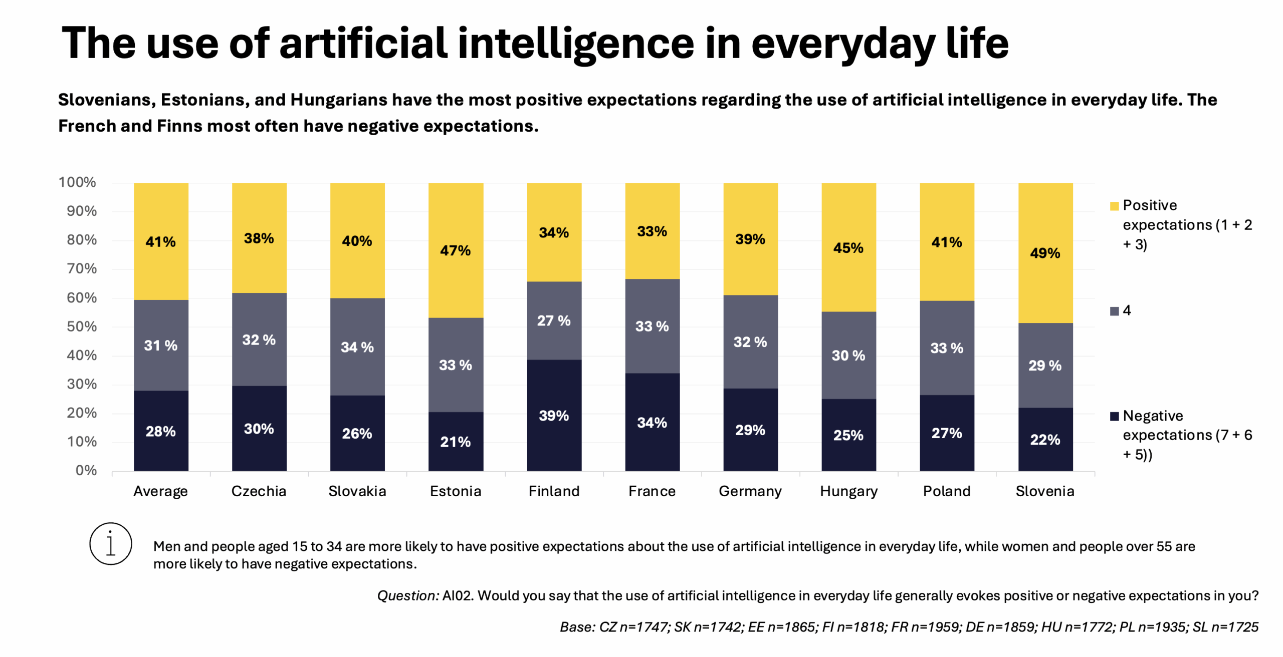 Public attitudes toward artificial intelligence are mixed. While 41% of respondents hold positive expectations about AI in everyday life, concerns persist. France stands out for its ambivalence: although many are impressed by AI’s capabilities, 60% worry about its future use and 62% describe it as ominous. More than half of French respondents fear AI could threaten security. In contrast, Estonia shows strong enthusiasm, with 62% describing AI as exciting and over half believing AI systems can outperform humans.