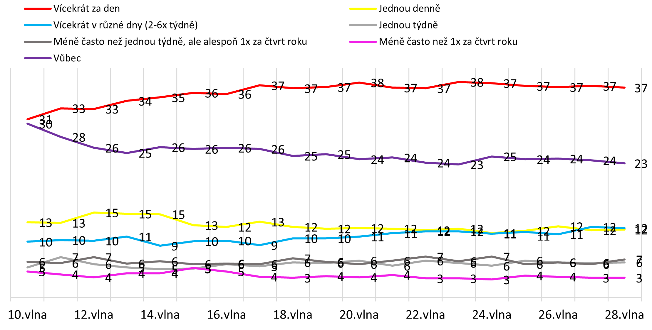 Nejvíce respondentů (v posledním měření 44 %) uvedlo, že komunikační platformy používají vícekrát za den. Tuto možnost vybralo 75 % lidí ve věku 16 až 24 let a tento podíl klesá s rostoucím věkem odpovídajících. Ve věkové skupině 35 až 44 let jde o 67 %, 55 až 64 let 26 % a z lidí starších 65 let je to 12 %. Více než třetina respondentů z této nejvyšší věkové kategorie (32 %) uvedla, že komunikační platformy nepoužívá vůbec.