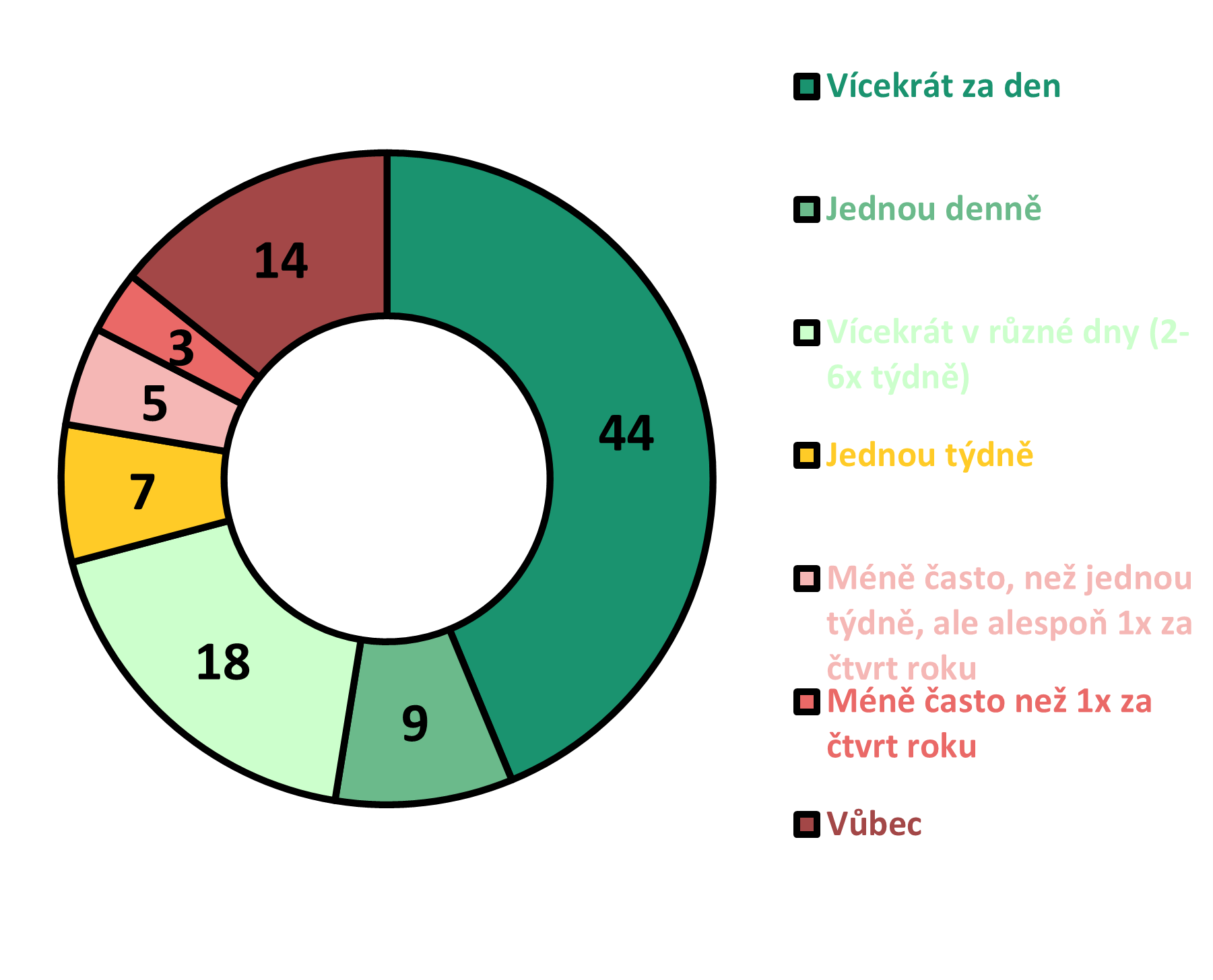 Zároveň se drží stabilní a vysoké procento intenzivních uživatelů, zhruba tři pětiny populace (v posledním měření 59,3 % respondentů), kteří navštěvují sociální sítě několikrát denně. Tato vysoká frekvence signalizuje, že pro většinu uživatelů se sociální sítě staly integrální, téměř automatickou součástí každodenní digitální rutiny (tzv. notifikační past, resp. fenomén chronically online[30]).