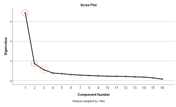 Původních 16 položek dotazníku PDTQ bylo proto transformováno na menší soubor nezávisle proměnných. K tomuto účelu byla použita Analýza hlavních komponent (PCA), jejíž cílem je právě snížit dimenzionalitu dat. PCA identifikuje nové, vzájemně nekorelované, latentní proměnné (hlavní komponenty nebo faktory), které vzniknou jako lineární kombinace manifestních proměnných. Faktory zachycují hlavní trendy a korelace v datech, čímž kondenzují informace do menšího počtu proměnných za cenu toho, že nevysvětlí veškerou variabilitu původních odpovědí. Faktorové proměnné mohou následně sloužit jako závisle proměnné při hledání vlivu charakteristik respondentů na schopnost odhalit deepfake. V určitém ohledu je faktorovou analýzu možno interpretovat též jako ověření smysluplnosti rozdělení původních otázek do kategorií dle autorů baterie.