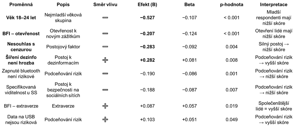 - Na stranu lepší detekce technických anomálií se staví respondenti s akcentovaným osobnostním rysem extraverze a zajímavě i ti, kteří zastávají postoj, že šíření dezinformací není hrozba nebo že přenášení dat přes USB není rizikové. Tento paradox naznačuje, že vysoké sebevědomí, které vede nejen k podceňování některých rizik (dezinformace, digitální/kybernetická bezpečnost) může být spojeno rovněž vyšší technickou všímavostí.