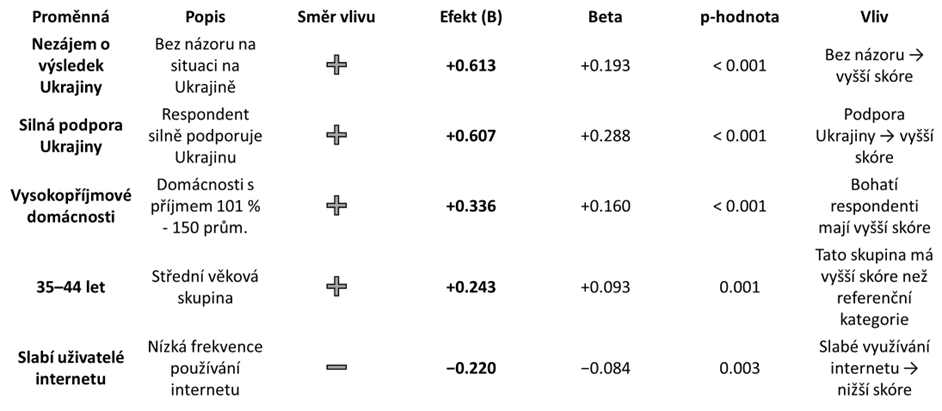 - S lepší detekcí/hodnocením důvěryhodnosti korelují respondenti z vysokopříjmových domácností a ti, kteří spadají do střední věkové skupiny 35–44 let. Klíčovým postojovým prediktorem se ukázal být postoj k válce na Ukrajině. Postoj, který není proruský (tj. buď silná podpora Ukrajiny, nebo nezájem/bez názoru na výsledek), koreluje s vyšším skóre důvěryhodnosti. Jinými slovy, zřejmě není příliš překvapivé, že proruští respondenti, kteří bývají klasicky spojování s konzumací anti-mainstreamových či alternativních médií a s radikálnějšími postoji, posuzují důvěryhodnost prezentovaných informací ve videu obtížněji.