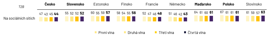 Nejvíce využívanou sítí ve sledovaných zemích je Facebook (85 %). Následují WhatsApp (58 %), Instagram (55 %) a YouTube (55 %). V průměru má pak 22 % uživatelů ze zemí V4+5 všechny příspěvky na svém profilu veřejné. Veřejné příspěvky mají nejméně často Finové (16 %), nebo i Češi a Francouzi (19 %). Slováci a Estonci jsou na 22 %, veřejné příspěvky má i 23 % Maďarů a 25 % Němců. Nejvíce příspěvky nechávají otevřené Poláci a Slovinci (27 %). A jsou to především muži a lidé starší 55 let.