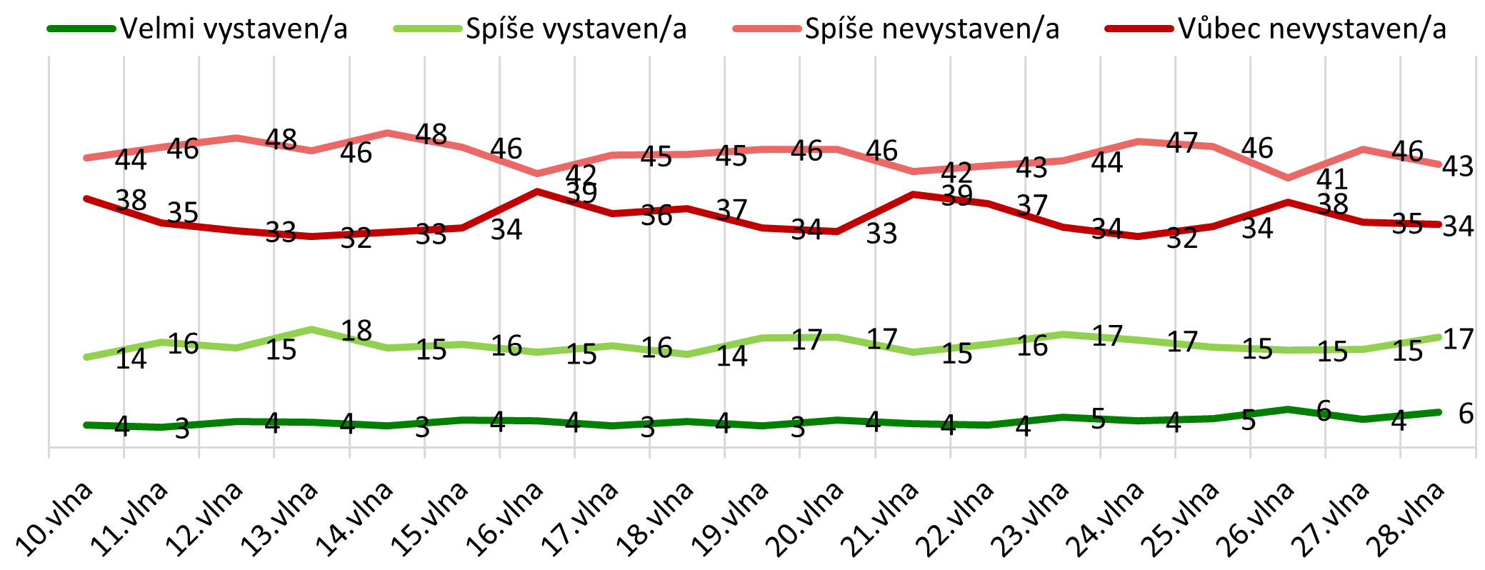 - V aktuální vlně průzkumu 77 % respondentů uvedlo, že dezinformacím spíše nejsou nebo vůbec nejsou vystaveni – 4 % pokles od posledního měření. Že jim nejsou vystavení vůbec si myslí zhruba třetina (34 %).