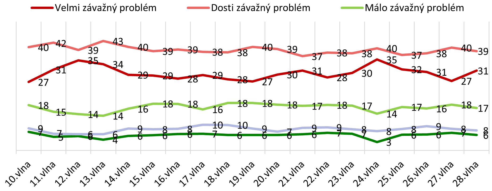 Po poklesu podílu respondentů, kteří považují dezinformace za „velmi závažný problém“ v minulé vlně, došlo nyní opět k nárůstu. Aktuálně je těchto respondentů 31 %. Skupina respondentů, kteří dezinformace hodnotí jako „dosti závažný problém“, je dlouhodobě největší a aktuálně tvoří 39 % respondentů. Respondentů, kteří nedokáží závažnost dezinformací posoudit, je v současné vlně výzkumu 8 %. Podle 17 % respondentů jsou pak dezinformace „málo závažný problém“ a 6 % odpovídajících uvádí, že dezinformace vůbec nejsou problémem.