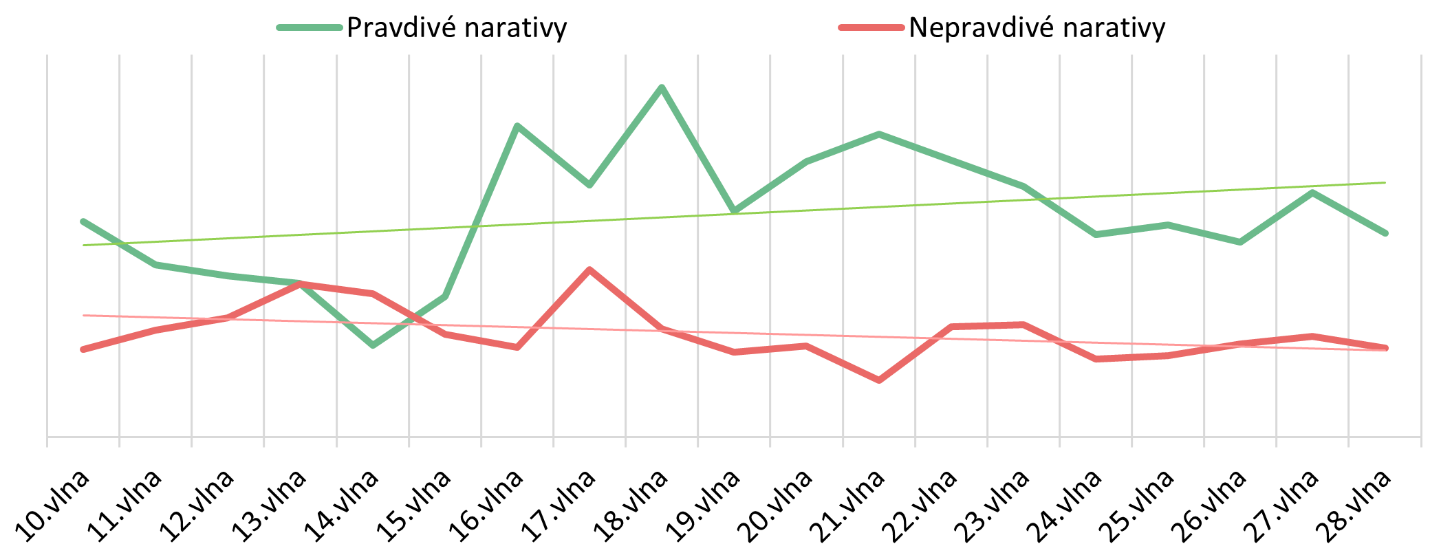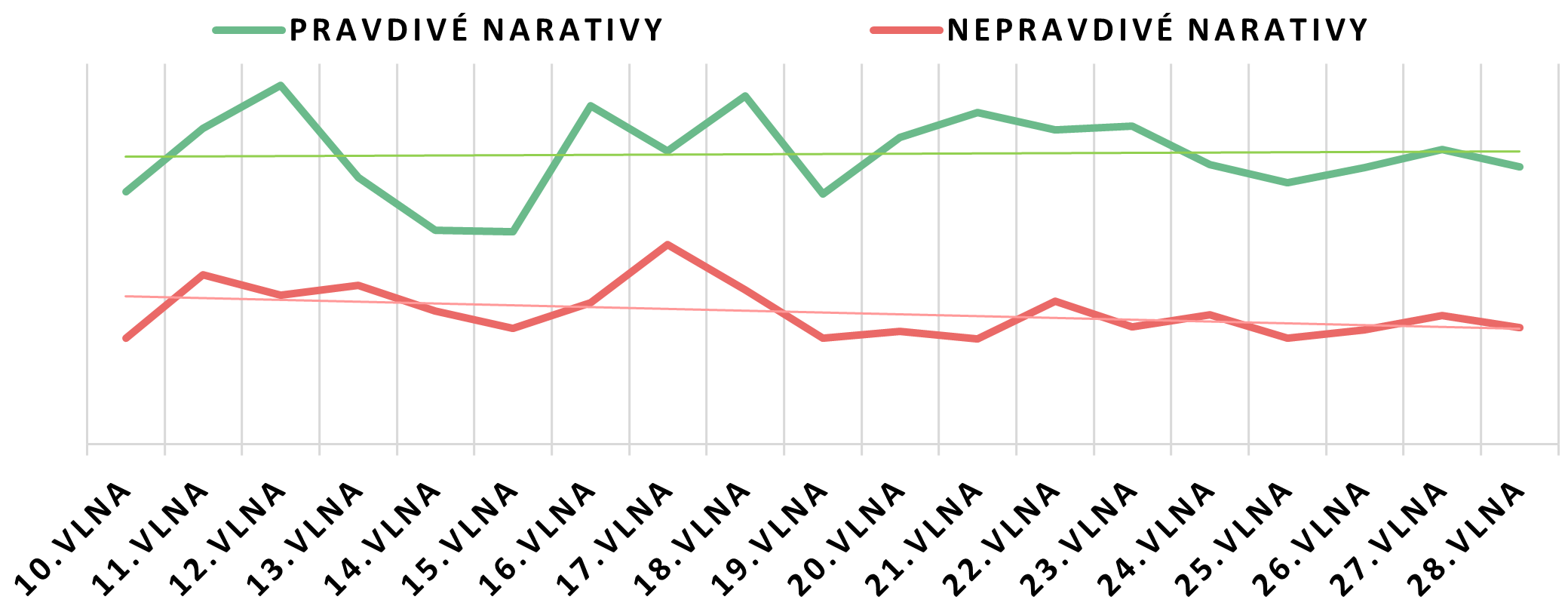 U povědomí o pravdivých narativech je při porovnání s minulou vlnou je vidět pokles. U nepravdivých narativů je vidět také, ale ve srovnání s pravdivými je pokles povědomí mírnější.