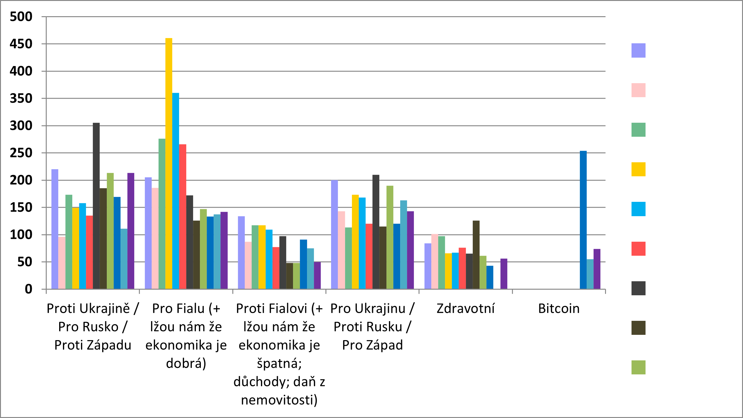 V aktuální vlně výzkumu vzrostl počet zachycených dezinformací proti Ukrajině/ proti západu (213). Počet zachycených dezinformací pro Ukrajinu/ pro západu (143) naopak klesl. Mírně narostl počet dezinformací o bitcoinové kauze (74).