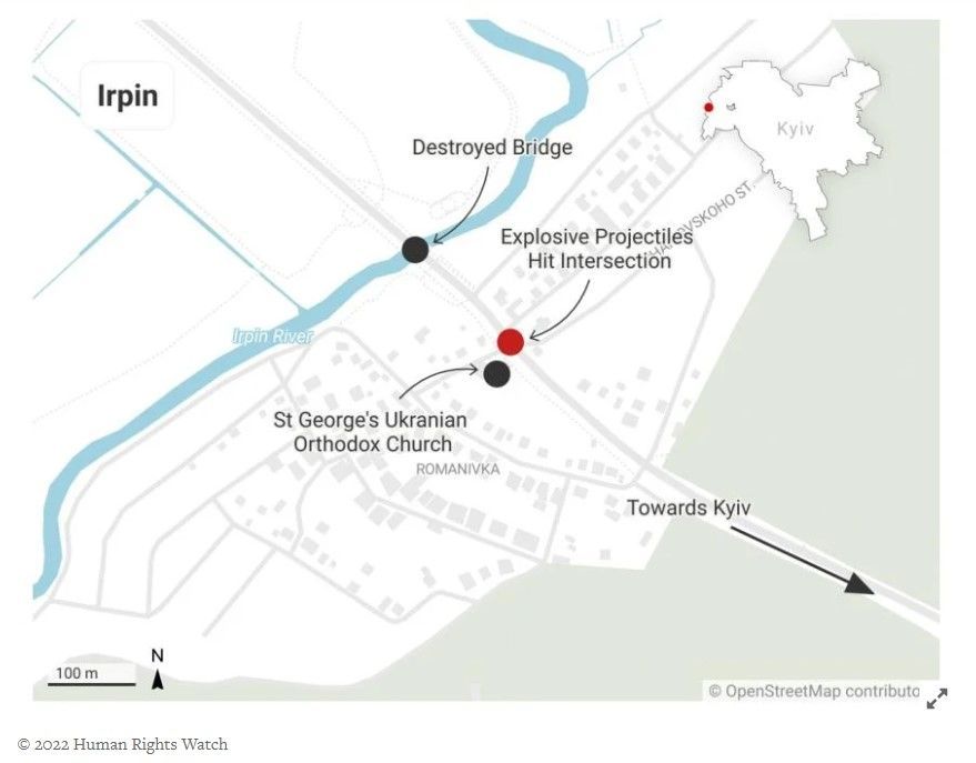„Dne 6. března 2022 ruské síly několik hodin ostřelovaly křižovatku na silnici, po které stovky civilistů utíkaly před postupem ruské armády přes sever Ukrajiny do Kyjeva,” zveřejnila organizace Human Rights Watch 8. března 2022.