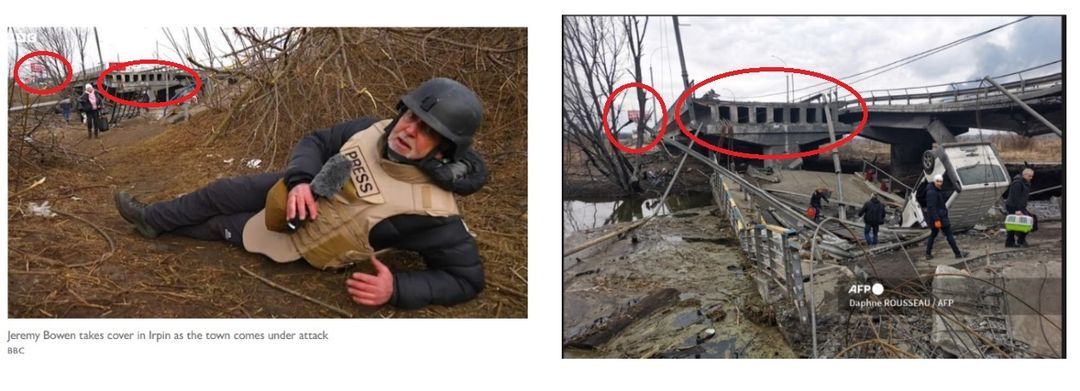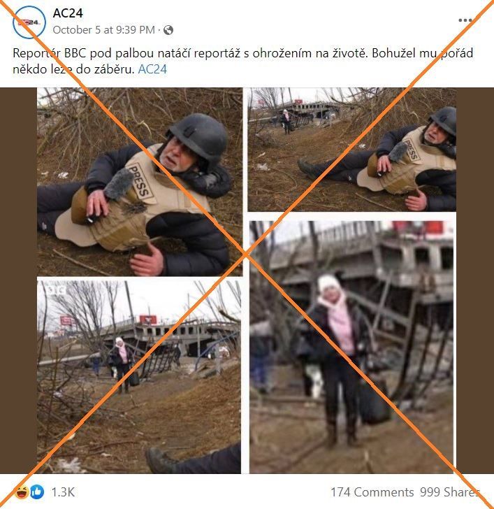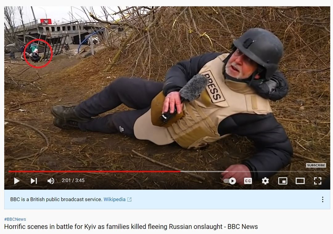 Na sociálních sítích se šíří záběr z reportáže BBC o civilistech prchajících před ruským ostřelováním ukrajinského města Irpiň se zavádějícím tvrzením, že reportér ležící na zemi situaci zveličuje, protože v pozadí je vidět poklidně kráčející žena. Toto tvrzení však nebere v úvahu nebezpečné okolnosti, za jakých byla reportáž natočena. Záběry jsou z 6. března 2022, kdy desítky lidí prchaly pěšky, aby unikly silnému ostřelování, což zachytila celá řada médií a organizace Human Rights Watch. Sám novinář uvedl, že střely dopadaly blízko místa, kde se nacházel, přičemž ve chvíli, kdy byl záběr natočen, se střelba na chvilku uklidnila.