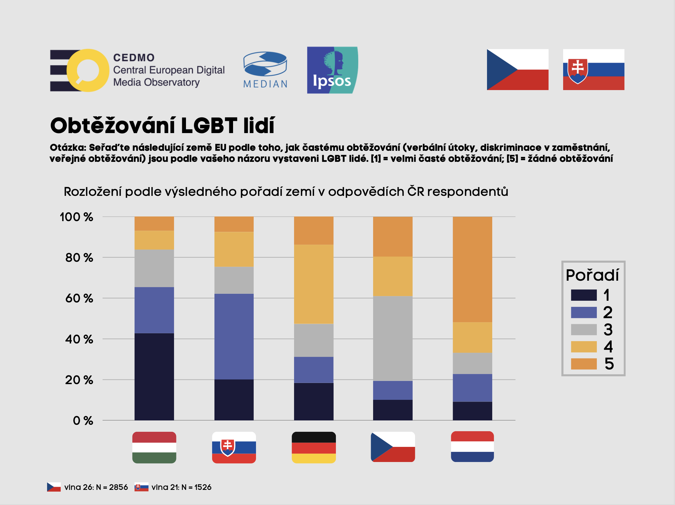 V kontextu obtěžování LGBT+ osob zařadili respondenti výzkumu CEDMO Trends Česko do lepší poloviny vybraných evropských zemí. Pouze 10 % respondentů označilo Česko za zemi, ve které jsou LGBT+ lidé nejvíce obtěžováni. Domnívají se, že hůře jsou na tom například Maďarsko (které označilo 43 % respondentů jako zemi, ve které jsou LGBT+ lidé velmi často obtěžováni), Slovensko (20 %), ale i Německo (18 %). Z porovnání s výstupy z mezinárodního výzkumu[1] Agentury Evropské unie pro základní práva (FRA) se však ukazuje, že Češi podceňují realitu. Podle FRA je Česko zemí s nejvyšší mírou obtěžování LGBT+ osob v EU (63 % LGBT+ lidí tuto zkušenost uvádí, ať už ve verbální nebo fyzické podobě).