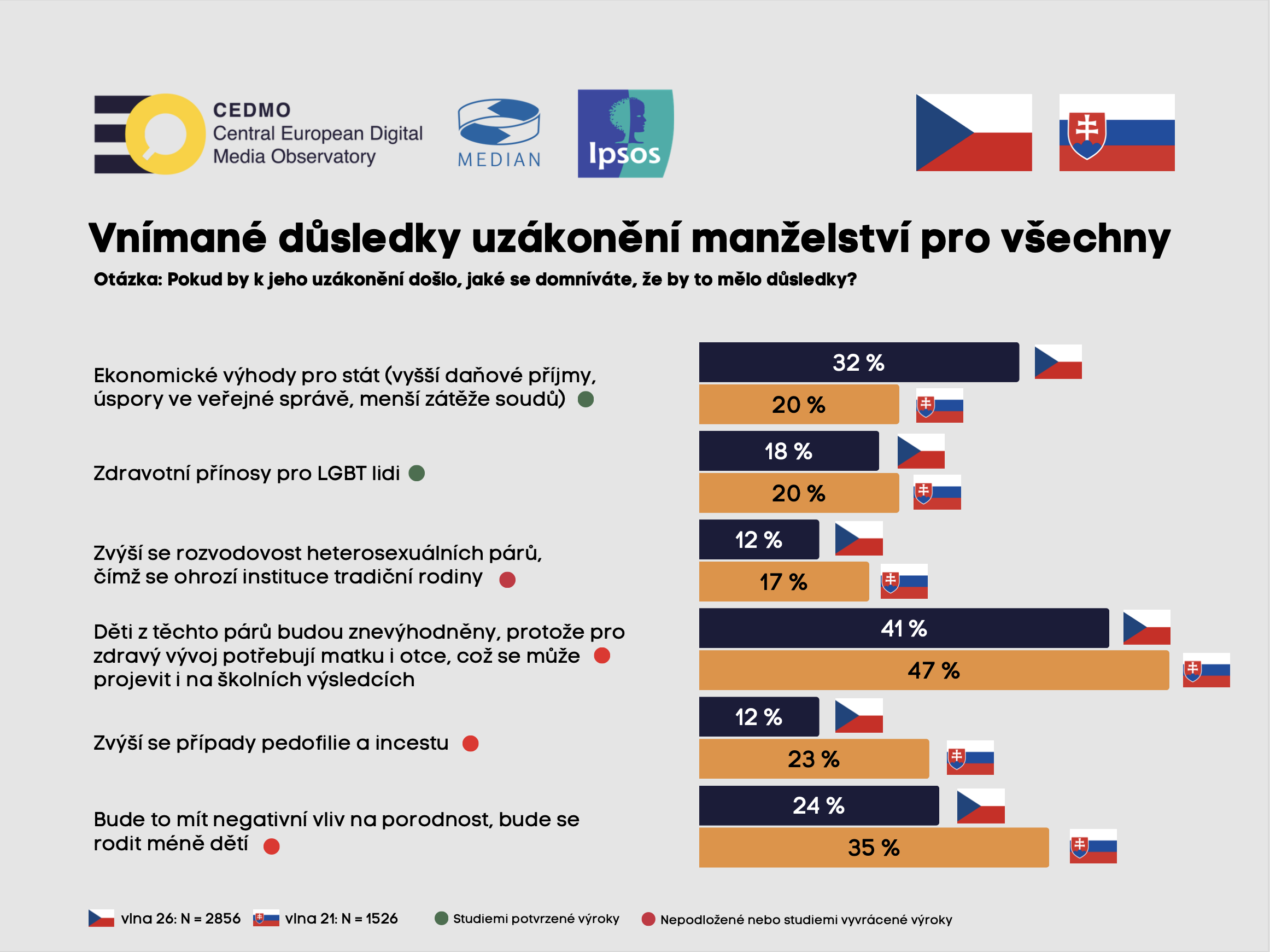 Silná je i víra v dezinformační narativy (zejména na Slovensku). Například tvrzení[8], že manželství pro všechny zvýší počet případů pedofilie či incestu, přijímá 23 % Slováků oproti 12 % Čechů. Podobně 35 % Slováků a 24 % Čechů věří, že by legalizace měla negativní dopad na porodnost.