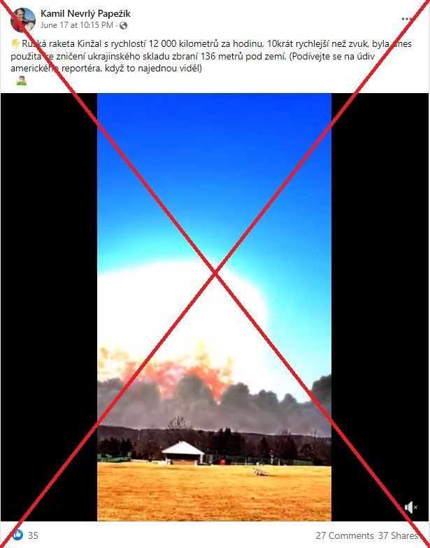 „Ruská raketa Kinžal s rychlostí 12 000 kilometrů za hodinu, 10krát rychlejší než zvuk, byla dnes použita ke zničení ukrajinského skladu zbraní 136 metrů pod zemí. (Podívejte se na údiv amerického reportéra, když to najednou viděl),” stojí v tomto příspěvku z 18. června 2022, který sdílelo téměř 40 uživatelů.