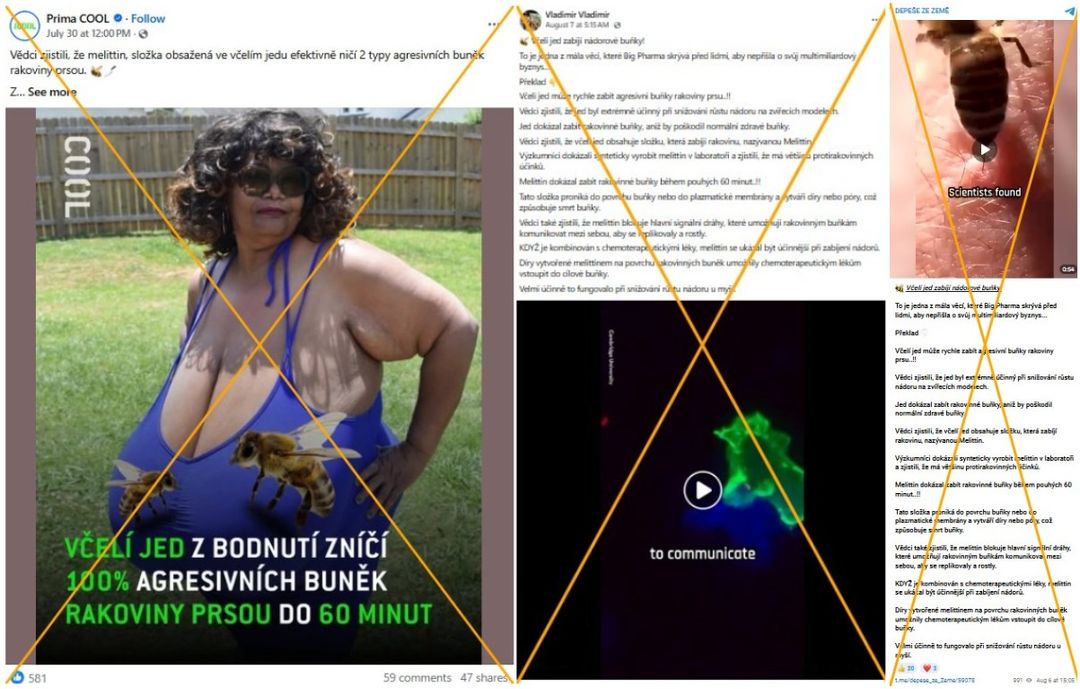 „Včelí jed z bodnutí zničí 100% agresivních buněk rakoviny prsou do 60 minut,” tvrdí například tento příspěvek z 30. července 2025, který na Facebooku sdílelo téměř 50 uživatelů. Jiné příspěvky, například zde, dokonce tvrdí, že tento fakt „Big Pharma skrývá před lidmi, aby nepřišla o svůj multimiliardový byznys”.