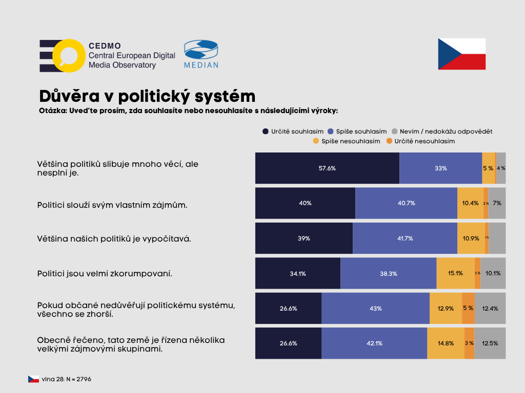 Navzdory vysoké míře nedůvěry v politiku a politický systém se říjnových voleb do Poslanecké sněmovny Parlamentu České republiky zúčastnilo bezmála 69 % oprávněných voličů. Výsledky reprezentativního šetření Středoevropské observatoře digitálních médií (CEDMO) přitom ukazují, že 91 % dotázaných nevěří, že politici plní své sliby, více než 80 % je považuje za vypočítavé a sledující vlastní zájmy a 72 % za velmi zkorumpované. Tato skepse může být jedním z faktorů, které zvyšují zranitelnost společnosti vůči dezinformacím a vlivovým operacím. Zároveň se nabízí otázka, zda právě tyto jevy nepřispívají k jejímu dalšímu prohlubování.
