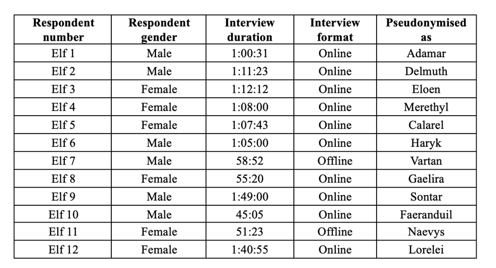 Following the ethical standards of social research involving sensitive information, we gave the respondents aliases derived from mythical Elves, using the method of pseudonymisation, to protect their anonymity (Lahman 2018, p. 81-87; also von Feigenblatt and Islam 2024). In especially sensitive cases, only a generic ‘Elf’ or ‘respondent’ are used in the text below. As further precautions, transcriptions were kept in locked files, stored on a password-protected hard drive kept in a vault at a location known only to the researchers.