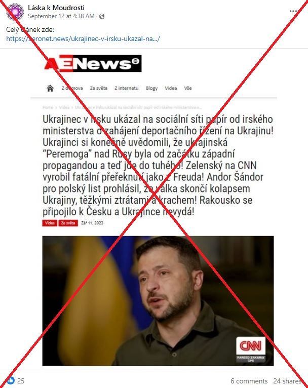 Začátkem června zahájila Ukrajina náročnou protiofenzívu ve snaze vytlačit ruskou armádu z okupovaných území na jihu a východě země. V této souvislosti se na sociálních sítích začalo v mnoha jazycích šířit nepravdivé tvrzení o tom, že irské úřady vyhrožují Ukrajincům „deportací“. Příspěvky obsahují zfalšovaný dopis irského ministerstva spravedlnosti, který podle evropských právních expertů, na které se AFP obrátila, obsahuje řadu právních nesrovnalostí. Irské úřady potvrdily, že žádný takový dokument nezaslaly. Text sdílený mezi českými uživateli také tvrdí, že Česká republika a Rakousko „oznámily“ , že nebudou vydávat uprchlíky na Ukrajinu. České úřady však agentuře AFP sdělily, že žádnou žádost o vydání neobdržely, a podle obou zemí není vyhýbání se vojenské službě dostatečným důvodem pro vydání.