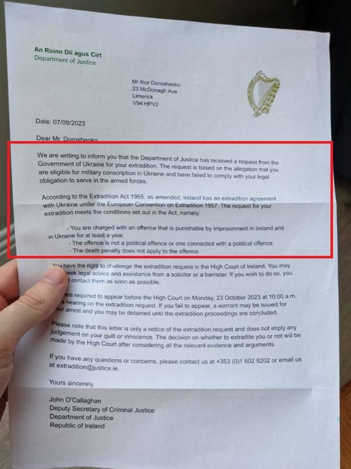 Dopis sdílený na sociálních sítích je datován 7. září 2023 a adresován jistému „panu Ihoru Dorošenkovi“. Zdá se, že je vytištěn na hlavičkovém papíře irského ministerstva spravedlnosti s jeho logem, a stojí v něm: „Touto cestou vás informujeme, že ministerstvo spravedlnosti obdrželo od ukrajinské vlády žádost o vaše vydání“.