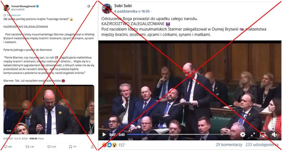 Małżeństwa między kuzynami pierwszego stopnia są legalne w Wielkiej Brytanii od wieków, a także w niektórych innych krajach europejskich. Pod koniec września w mediach społecznościowych pojawiło się nagranie wraz z twierdzeniem, że laburzystowski premier Keir Starmer odrzucił propozycję zakazu takich małżeństw, i że „zalegalizował” kazirodztwo „ponieważ domagała się tego społeczność muzułmańska”. W niektórych postach błędnie twierdzi się, że brytyjski premier zalegalizował małżeństwa między „ojcami i córkami, synami i matkami”. Dowodem ma być nagranie z parlamentu brytyjskiego z marca 2025 roku z krótką wypowiedzią premiera. W rzeczywistości premier Starmer odrzuca propozycję opozycyjnego posła zakazującą małżeństw między kuzynami. Prawo w kwestii małżeństw nie zmieniło się ostatnio w Wielkiej Brytanii, małżeństwa między bliskimi krewnymi, czyli między „ojcami i córkami, synami i matkami” na początku października 2025 roku były nielegalne .