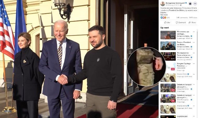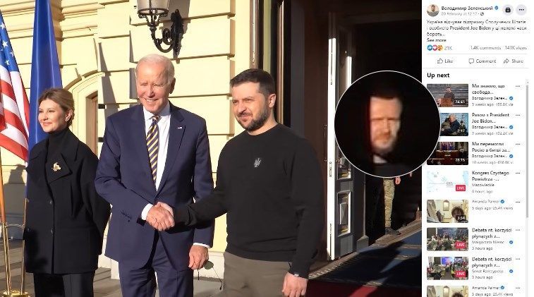 Jeśli natomiast chodzi o zrzut ekranu, na którym widać żonę prezydenta Ukrainy, Bidena oraz Zełeńskiego, którzy wymieniają uścisk dłoni, to oryginalne wideo odnaleźliśmy na oficjalnym profilu prezydenta Ukrainy na Facebooku. Również po zbliżeniu widać, że stojący w tle mężczyzna wygląda zupełnie inaczej niż prezydent Ukrainy: ma spodnie moro oraz inny zarost niż Zełeński.
