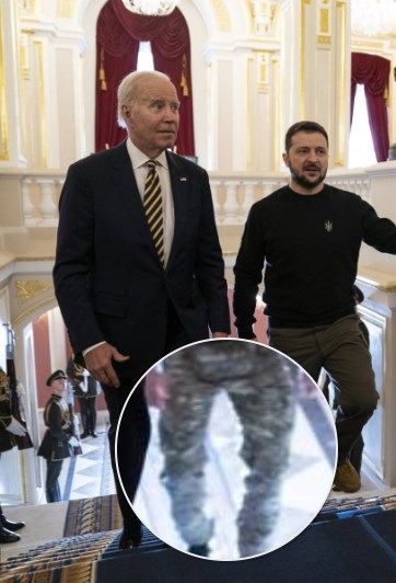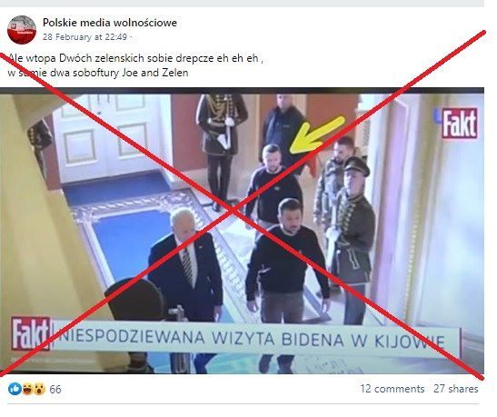 Publikacja zawiera zrzut ekranu z nagrania opublikowanego przez Fakt, gdzie możemy przeczytać w nagłówku: „Niespodziewana wizyta Bidena w Kijowie”. Nagranie przedstawia Zełeńskiego i Bidena, którzy wchodzą po schodach pałacu prezydenckiego w Kijowie. Amerykański prezydent odwiedził Kijów 20 lutego 2023 roku, a wizytę tę do ostatniej chwili utrzymywano w tajemnicy.