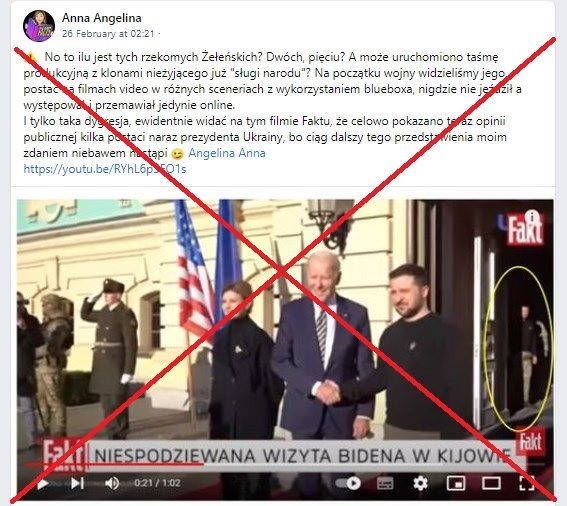 W mediach społecznościowych rozpowszechniane są fałszywe treści, które utrzymują, że ochroniarz Wołodomira Zełeńskiego to jego sobowtór. Publikacjom towarzyszy materiał wideo z niedawnej wizyty prezydenta Stanów Zjednoczonych Joe Bidena w Kijowie, podczas której rzekomo udało się uchwycić sobowtóra ukraińskiego prezydenta. Tożsamość tego mężczyzny nie jest jednak tajemnicą – to Maksym Doniec, który od 2019 roku jest ochroniarzem Zełeńskiego i był z nim wielokrotnie fotografowany w przeszłości.
