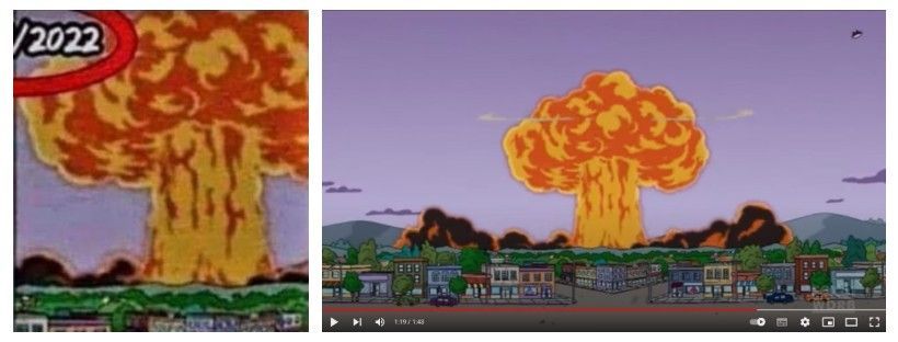 Obraz eksplozji pokazany we wpisie na Facebooku wydaje się pochodzić z 20 odcinka 21 sezonu, wyemitowanego 2 maja 2010 roku. W odcinku o tytule „To surveil, with love” kierownictwo elektrowni atomowej ukrywa odpady radioaktywne w torbie Homera, ponieważ nie ma już więcej miejsca na ich przechowywanie. Homer zapomina wziąć torbę ze stacji kolejowej, a policja wysadza ją, powodując powstanie chmury w kształcie grzyba, którą widać w poście na Facebooku. Eksplozji nie spowodowała bomba, jak sugeruje post na Facebooku. W odcinku tym nie ma też żadnych sugestii, by rzekoma eksplozja miała nastąpić 5 maja 2022 r.