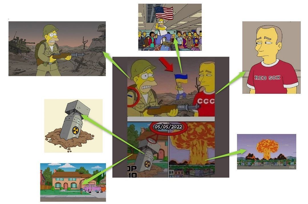 Obraz Homera Simpsona machającego ukraińską flagą w tle, pochodzi z ósmego odcinka 17 sezonu, który ukazał się w 2005 roku. W oryginalnej wersji Homer trzyma amerykańską flagę. W zmontowanym obrazie, który udostępniany jest na Facebooku, flagę zmieniono na ukraińską.