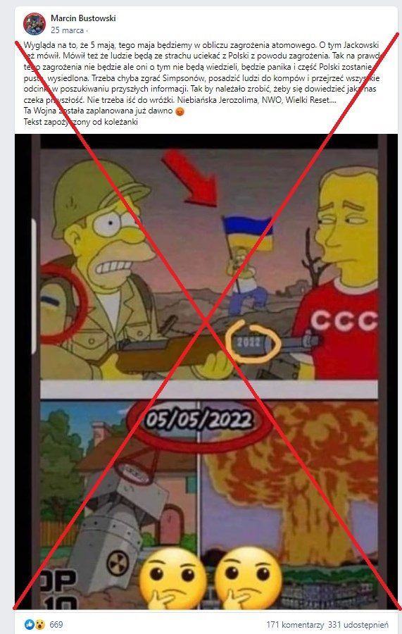 „Wygląda na to, że 5 maja staniemy wobec zagrożenia atomowego. (…) Trzeba chyba zgrać Simpsonów, posadzić ludzi do kompów i przejrzeć wszystkie odcinki w poszukiwaniu przyszłych informacji” – pisze jeden z użytkowników w publikacji udostępnionej 25 marca na Facebooku.