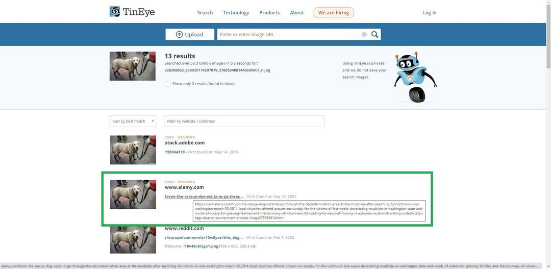 Zrzut ekranu z Google Images wykonany 10 lutego 2023 roku. Zielona strzałka jest autorstwa agencji AFPW naszym przypadku wyszukiwanie zdjęcia psa ratowniczego przy pomocy Google Lens doprowadziło do artykułu opublikowanego przez Wall Street Journal. Z kolei wyszukiwanie przy pomocy programu Tineye, który skuteczny jest w znajdywaniu stron zawierających zdjęcia stockowe oraz portali agencji informacyjnych, zaprowadziło nas do tego samego zdjęcia opublikowanego na stronie Alarmy. „Tryon, pies ratowniczy czeka, aby przejść przez obszar przy błotach w poszukiwaniu ofiar w Oso, Waszyngton, 30 marca 2014 roku” – czytamy na stronie. Zdjęcie przypisywanie jest Rickowi Wilkingowi oraz agencji Reutera.
