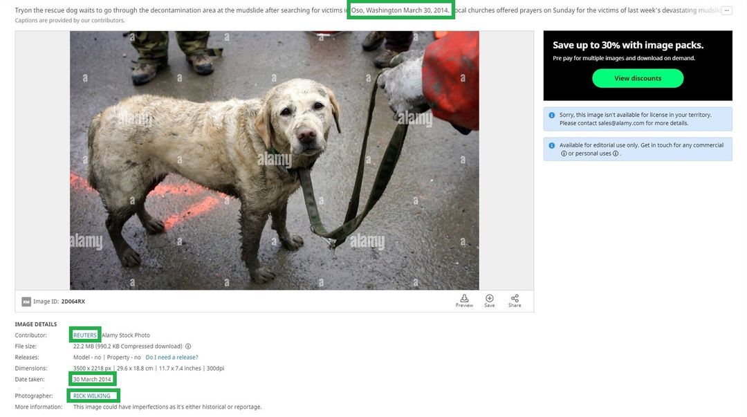 Fotografia to kolejny przykład wyrwanych z kontekstu treści, które zalewają media społecznościowe po trzęsieniu ziemi w Turcji i Syrii 6 lutego 2023 roku. Pies, którego widzimy na zdjęciu to Tyron, którego sfotografowano w Stanach Zjednoczonych, kiedy pomagał ratownikom w poszukiwaniu ofiar lawiny błotnej w Oso w stanie Waszyngton w marcu 2014 roku.