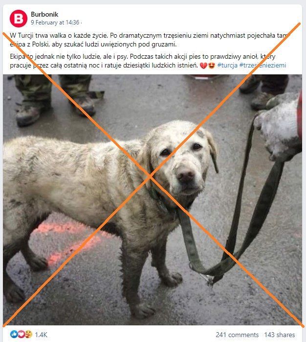 „W Turcji trwa walka o każde życie. Po dramatycznym trzęsieniu ziemi natychmiast pojechała tam ekipa z Polski, aby szukać ludzi uwięzionych pod gruzami” – czytamy w publikacji udostępnionej wraz ze zdjęciem psa 9 lutego 2023 roku na Facebooku. „Ekipa to jednak nie tylko ludzie, ale i psy. Podczas takich akcji pies to prawdziwy anioł, który pracuje przez całą ostatnią noc i ratuje dziesiątki ludzkich istnień” – czytamy dalej.