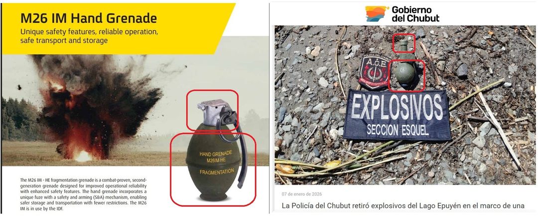 „Władze argentyńskie poinformowały, że granaty M26 (używane przez armię izraelską) znaleziono w rejonie jeziora Epuyen w Chubut” –twierdzi m.in. użytkownik platformy X.