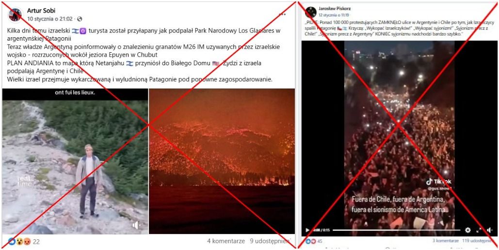 Pożary na południu Argentyny w rejonie Patagonii zniszczyły tysiące hektarów lasów w styczniu 2026 roku, wywołując przy okazji masowe oskarżenia w mediach społecznościowych wobec Izraelczyków o rzekomo dokonywanych podpaleniach dokonywanych w celu przejęcia kontroli nad gruntami w tym kraju. Na poparcie tej teorii, użytkownicy udostępniali różne filmy, zdjęcia i wiadomości, łącząc je z antysemicką teorią spiskową funkcjonującą od dekad, zwaną „planem Andinia”. Przeprowadzona przez agencję AFP weryfikacja wykazała jednak, że większość rzekomych dowodów nie ma związku z pożarami, a władze argentyńskie nie ustaliły jeszcze, kim są ewentualni podpalacze.