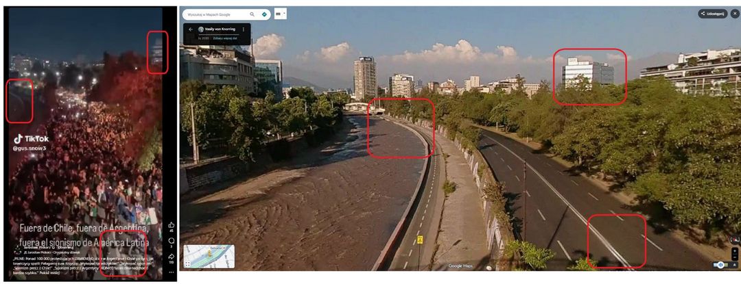 Zlokalizowaliśmy miejsce gdzie nakręcono film. Zestawiając zrzut ekranu z filmu ze zdjęciem z tureckiej państwowej agencji informacyjnej Anadolu można potwierdzić, że protest miał miejsce nad brzegiem rzeki Mapocho w centrum Santiago de Chile. Wyszukiwanie przy użyciu funkcji Street View na Mapach Google pozwoliło stwierdzić, że film został nakręcony z mostu dla pieszych Ramalac, z którego w tle widać te same budynki, co w viralowym nagraniu.