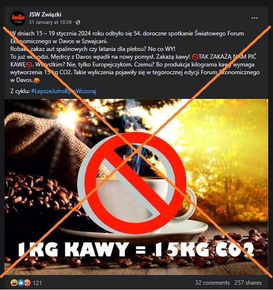 „Mędrcy z Davos wpadli na nowy pomysł. Zakażą kawy!” – czytamy w poście na Facebooku, który od 31 stycznia 2024 roku został udostępniony setki razy. W poście dodano również, że kawa zostanie zakazana, ponieważ „produkcja kilograma kawy wymaga wytworzenia 15 kg CO2. Takie wyliczenia pojawiły się w tegorocznej edycji Forum Ekonomicznego w Davos”.