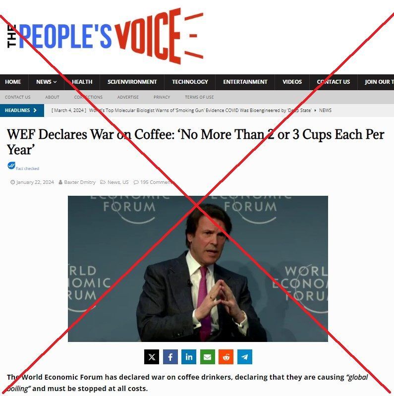 Przeprowadziliśmy wyszukiwanie przy użyciu słów kluczowych w języku angielskim, takich jak „kawa” i „Światowe Forum Ekonomiczne”, i natrafiliśmy na artykuł portalu „The People’s Voice” opublikowane 22 stycznia 2024 roku.