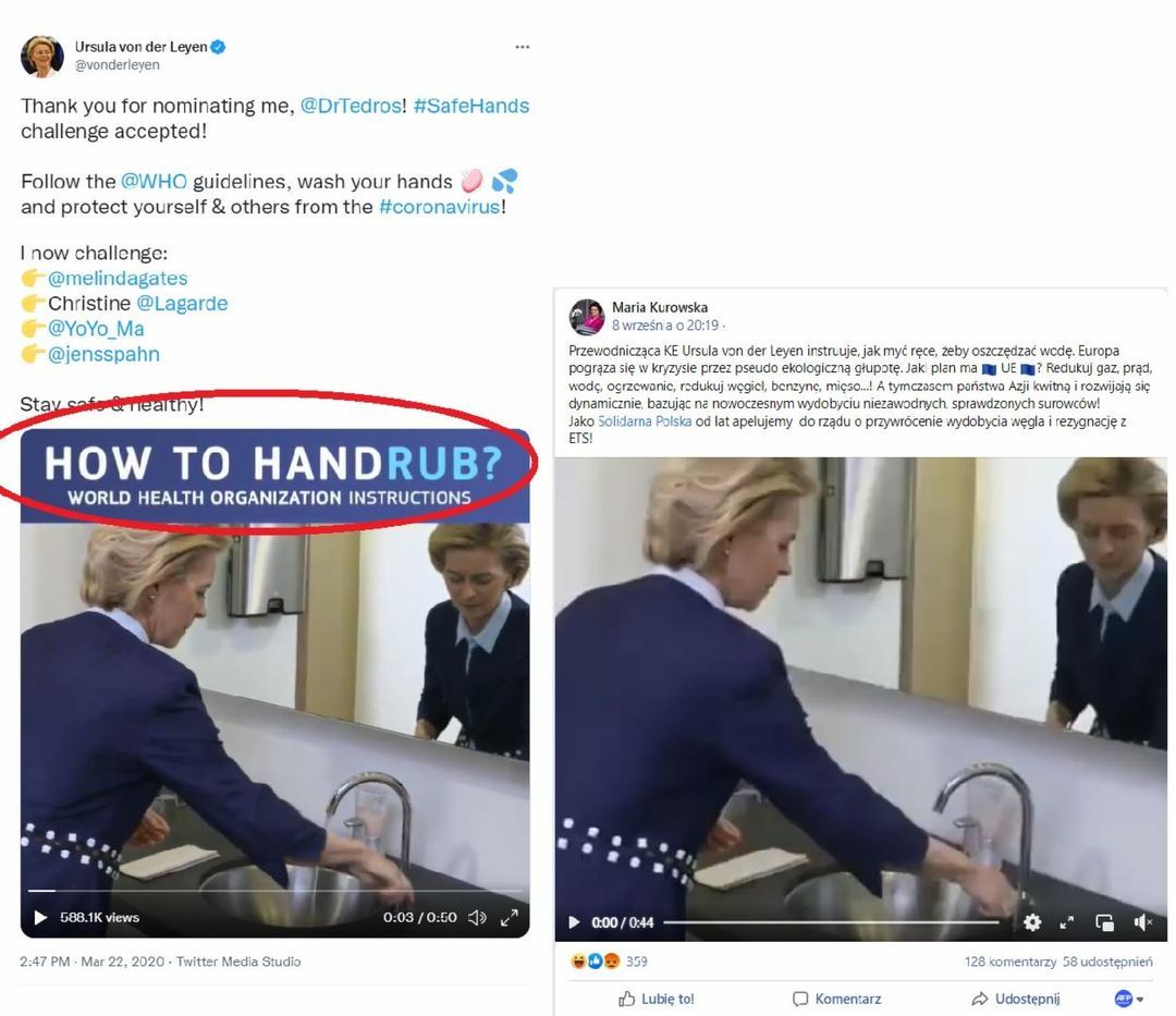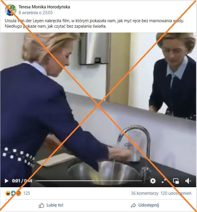 Nagranie z szefową Komisji Europejskiej, która myje swoje ręce, pochodzi z 2020 roku i powstało po to, by pokazać metodę zapobiegania zakażeniu koronawirusem SARS-CoV-2, a nie jako instruktarz „oszczędzania wody”, jak błędnie twierdzili użytkownicy mediów społecznościowych. W publikacjach z początkuwrześnia 2022 roku, które miały setki udostępnień, film został wyrwany z kontekstu i wyśmiewał Ursulę von der Leyen za promowanie drobnego gestu dla ochrony środowiska. W rzeczywistości film został stworzony w celu promowania prawidłowego mycia rąk na początku pandemii Covid-19 i nie miał nic wspólnego z ekologią.