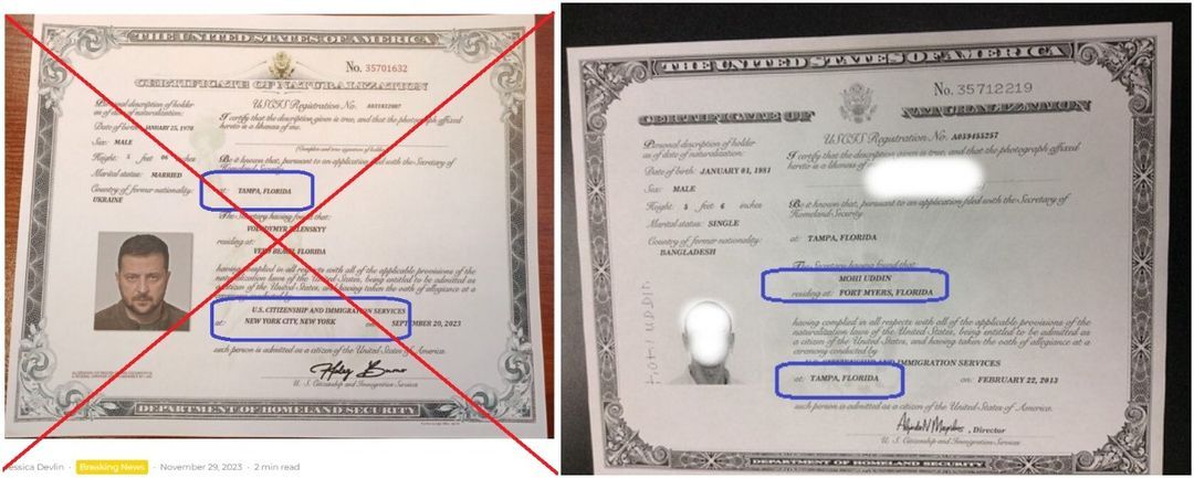 Posty w języku polskim, takie jak ten na platformie X (dawny Twitter) z 4 grudnia 2023 r., udostępniają zdjęcie dokumentu o nazwie „US Certificate of Naturalization” (amerykański certyfikat naturalizacji). W podobnym poście na Facebooku czytamy: „Zełenski przygotowuje plan ucieczki do Stanów Zjednoczonych: pracownik amerykańskich służb specjalnych ujawnił w Internecie informację o przygotowaniu schronienia dla prezydenta Ukrainy”.