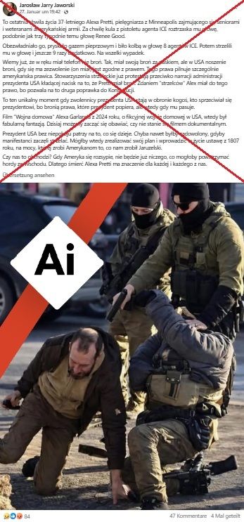 Media społecznościowe są pełne drastycznych materiałów filmowych z momentu, w którym federalni agenci imigracyjni zastrzelili 37-letniego pielęgniarza oddziału intensywnej terapii Alexa Prettiego w Minneapolis w stanie Minnesota. Jednak jedno z domniemanych ujęć z miejsca zdarzenia zostało zmanipulowane przy użyciu sztucznej inteligencji. Eksperci potwierdzili, że obraz był syntetycznym ulepszeniem autentycznego nagrania z miejsca strzelaniny, o czym świadczy fakt, że jednej z postaci brakuje głowy.