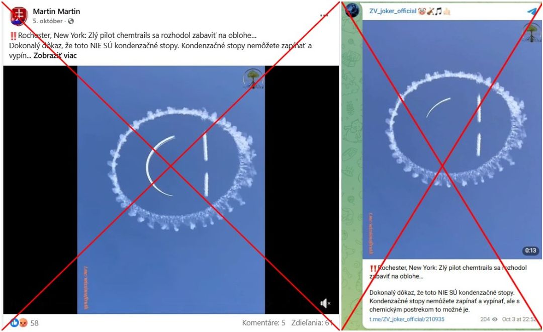 „Rochester, New York: Zlý pilot chemtrails sa rozhodol zabaviť na oblohe,“ začína slovenský príspevok na Facebooku, ktorý bol od 5. októbra zdieľaný vyše 60-krát. Obsahuje video, na ktorom lietadlo na oblohe kreslí smajlíka. „Dokonalý dôkaz, že toto NIE SÚ kondenzačné stopy. Kondenzačné stopy nemôžete zapínať a vypínať, ale s chemickým postrekom to možné je.“
