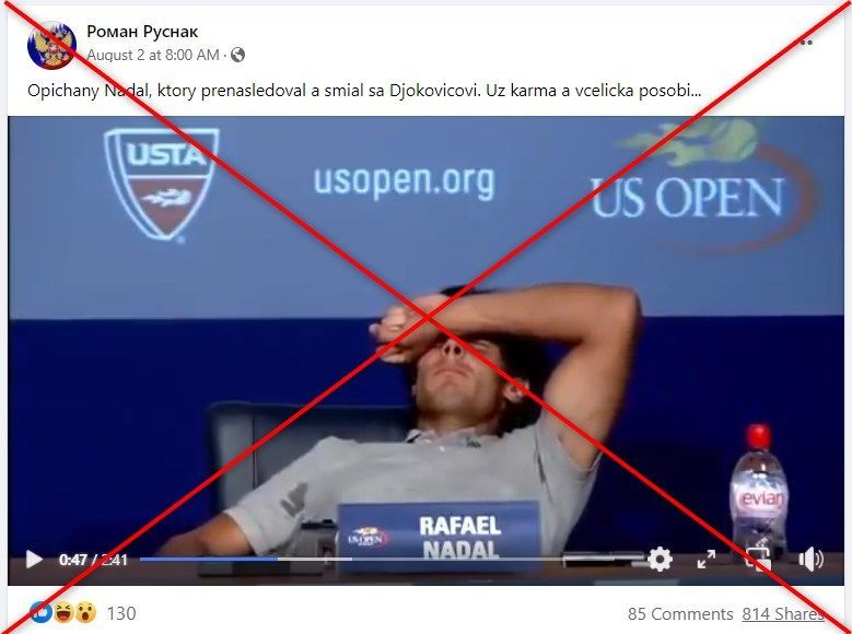 Video z tlačovej konferencie, na ktorom Rafael Nadal od bolesti spraví grimasu a musí sa oprieť na stoličke, bolo na Facebooku 2. augusta 2022 zverejnené spolu s popisom„Opichany Nadal, ktory prenasledoval a smial sa Djokovicovi. Uz karma a vcelicka posobi…“.