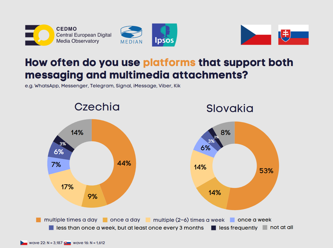 Chat platforms such as WhatsApp, Messenger or Telegram are used at least once a day by 53% of respondents in the Czech Republic and 67% in Slovakia. 44% of people in the Czech Republic and 53% in Slovakia use them more than once a day. Conversely, 14% of Czechs and only 8% of Slovaks do not use them at all, indicating a higher level of digitalisation of everyday communication in Slovakia.