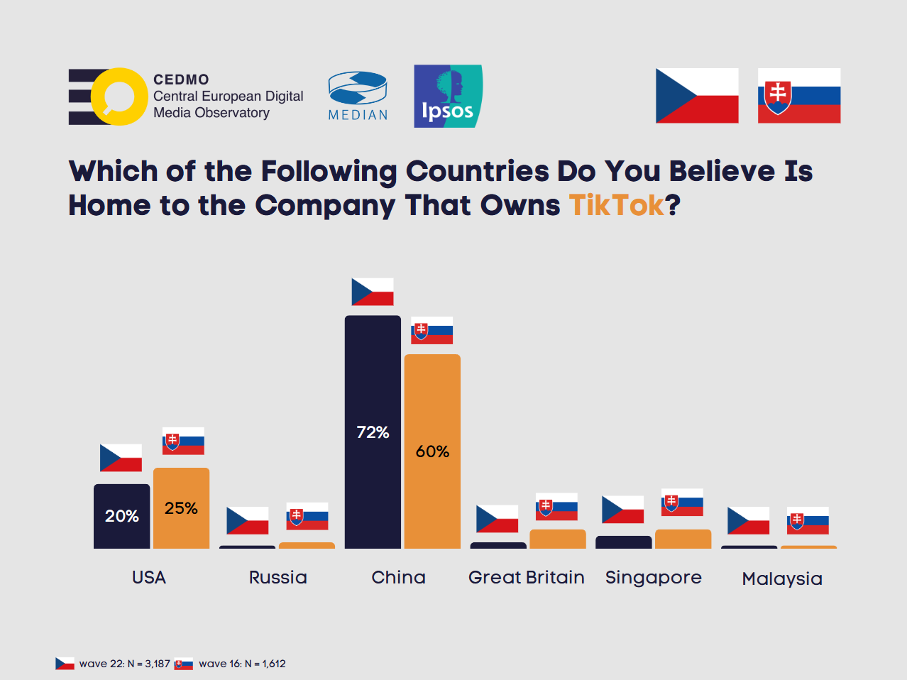Awareness of TikTok’s Chinese origin is relatively high in both populations, especially in the Czech Republic. Most respondents from the Czech Republic and Slovakia correctly associate this channel with China. While in the Czech Republic, 72% of the research participants demonstrated this knowledge, in Slovakia the proportion was lower – 60%. At the same time, however, a relatively large proportion of people think that TikTok service originates from the USA (20% of respondents in the Czech Republic, 25% in Slovakia).