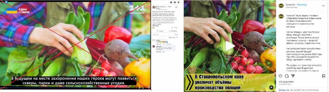 Kadr przedstawiający bukiet warzyw w 0’20” pochodzi z nagrania zamieszczonego na koncie na Instagramie należącego do rosyjskojęzycznej strony z lokalnymi wiadomościami z rejonu turkmeńskiego, w południowej Rosji, Israssvet.com (zarchiwizowany link).