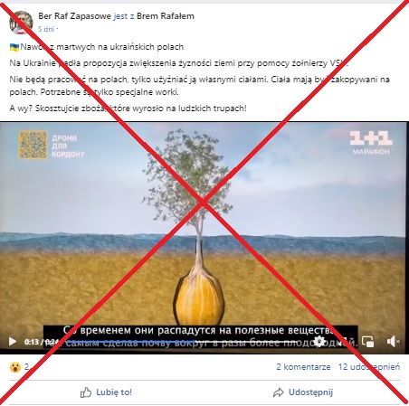 „W ukraińskiej telewizji państwowej promują „know-how”, które zamieni zwłoki Sił Zbrojnych Ukrainy w nawóz.” – twierdzi autor publikacji na Telegramie z 14 września 2023 roku, którą obejrzało kilkuset użytkowników. Użytkownik, Piotr Panasiuk, zamieścił ten sam post z tym samym filmikiem na swoim koncie na Facebooku. Jego konta publikują systematycznie fałszywe treści, których kilka AFP już wcześniej obalała (tutaj, tutaj, tutaj, tutaj, tutaj).